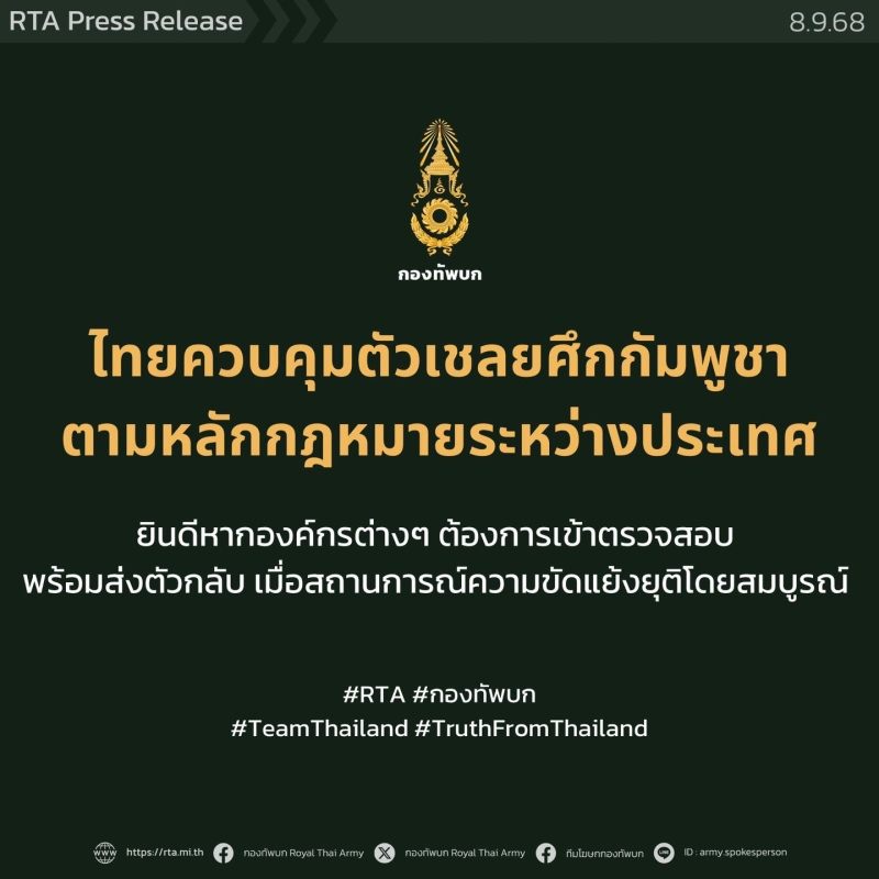 ทบ.เผยไทยควบคุมตัวเชลยศึกกัมพูชาตามกฎหมายระหว่างประเทศ ยินดีหากองค์กรต่างๆ ต้องการเข้าตรวจสอบ พร้อมส่งตัวกลับเมื่อสถานการณ์ความขัดแย้งยุติโดยสมบูรณ์