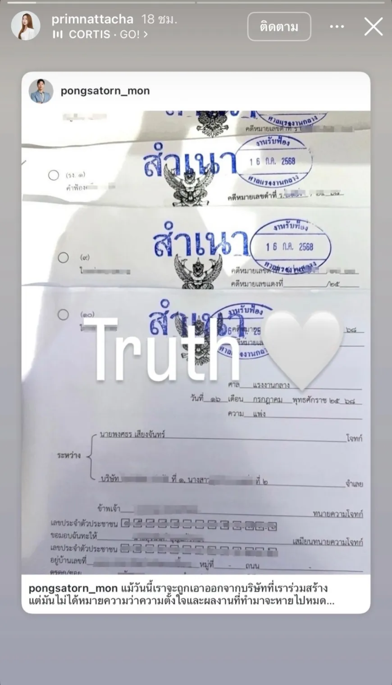 ด้านคู่กรณีซึ่งเป็นหุ้นส่วนร่วมก่อตั้งกิจการกับออม ก็ไม่อยู่เฉย ออกมาเคลื่อนไหวผ่านโซเชียลเช่นกัน โดยโพสต์ภาพสำเนาคำฟ้องพร้อมข้อความสั้น ๆ ว่า Truth (ความจริง) ก่อนจะรีโพสต์แถลงการณ์ของแบรนด์ พร้อมเขียนเพิ่มว่า เข้าถึงโซเชียลแบรนด์ตัวเองยังไม่ได้เลย #ความจริงเป็นสิ่งไม่ตาย
