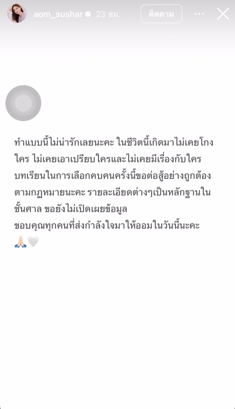 นอกจากนี้ ออมยังโพสต์ผ่านไอจีสตอรี่ส่วนตัว ระบุข้อความชัดเจนว่า ทำแบบนี้ไม่น่ารักเลยนะคะ เกิดมาไม่เคยโกงใคร ไม่เคยเอาเปรียบใคร และไม่เคยมีเรื่องกับใครค่ะ