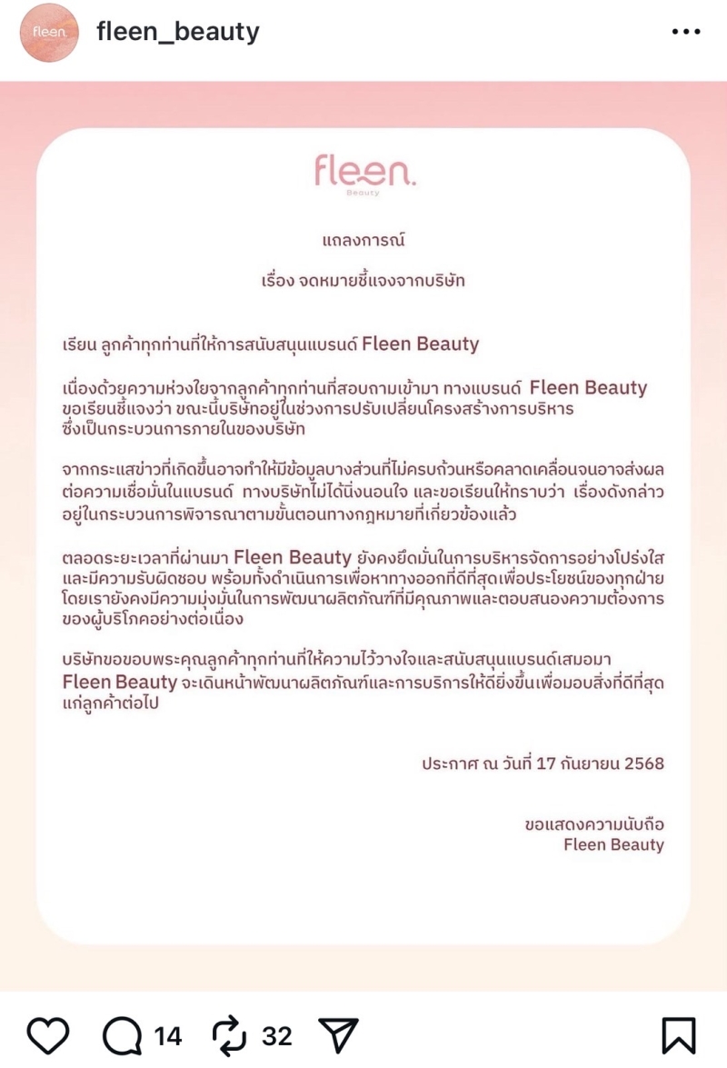ท่ามกลางกระแสดรามาที่ร้อนแรง บริษัทเครื่องสำอางดังกล่าวได้ออกแถลงการณ์ในวันที่ 17 กันยายน 2568 โดยชี้แจงว่า บริษัทกำลังอยู่ระหว่างการปรับโครงสร้างภายใน พร้อมยืนยันว่า จะดำเนินการด้วยความโปร่งใสและรับผิดชอบต่อทุกฝ่าย