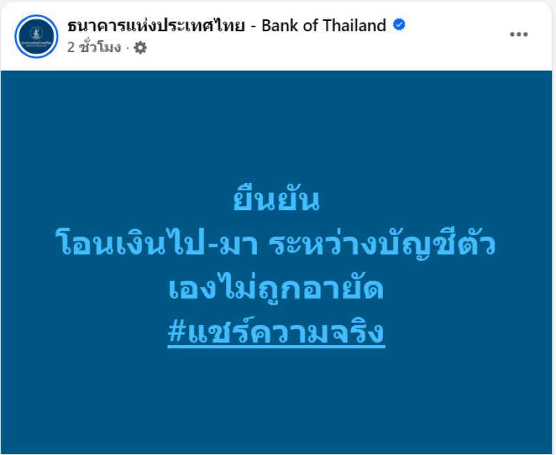 ล่าสุด ทางด้าน ธนาคารแห่งประเทศไทย – Bank of Thailand ออกมาชี้แจงในประเด็นดังกล่าว ระบุว่า โอนเงินไป-มา ระหว่างบัญชีตัวเองไม่ถูกอายัด #แชร์ความจริง