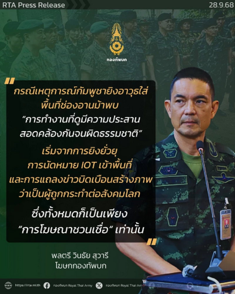 จากกรณี ทีมโฆษกกองทัพบก ระบุว่า เหตุการณ์กัมพูชายิงอาวุธหลายขนาดใส่พื้นที่ช่องอานม้า เป็นการวางแผนล่วงหน้า ทั้งการยั่วยุด้วยอาวุธ การนัดหมายคณะ IOT เข้าพื้นที่ และการแถลงบิดเบือนกล่าวหาไทย ทั้งหมดเป็นเพียง การสร้างสถานการณ์ ของฝ่ายกัมพูชา เมื่อวานนี้