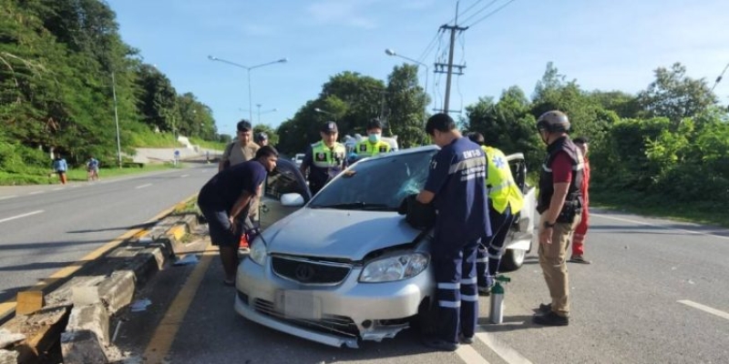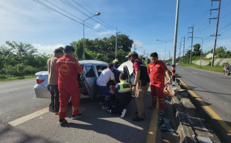 เก๋งหลบหมาตัดหน้า เสียหลักอัดเสาไฟฟ้า หญิงวัย 34 เจ็บหนักติดคาซาก