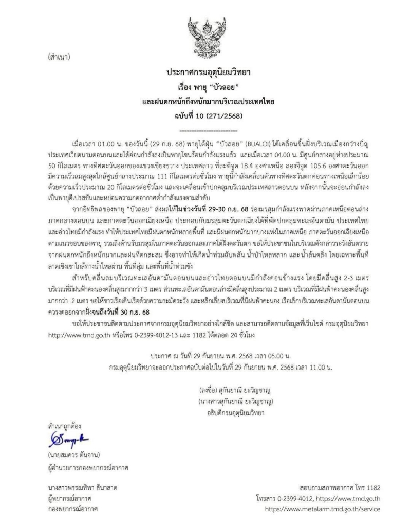 วันที่ 29 ก.ย. 2568 ทางกรมอุตุนิยมวิทยาได้อัปเดตพายุบัวลอย ในช่วงเช้านี้