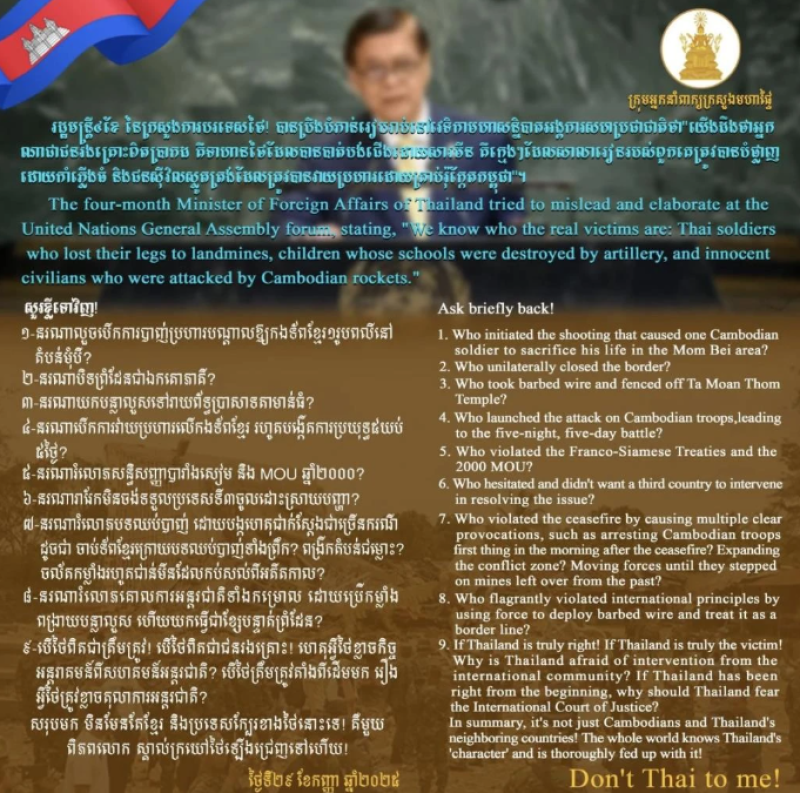 ทางกระทรวงมหาดไทยกัมพูชาออกแถลงการณ์ตอบโต้ นายสีหศักดิ์ พวงเกตุแก้ว รัฐมนตรีว่าการกระทรวงต่างประเทศของไทย ที่แถลงกรณี ความขัดแย้งบริเวณชายแดนระหว่างไทยและกัมพูชาในที่ประชุมสมัชชาใหญ่แห่งสหประชาชาติ ซึ่งมีการระบุว่า ไทยคือผู้สูญเสียที่แท้จริง ที่มีทหารไทยต้องสูญเสียขาจากการเหยียบทุ่นระเบิด เด็กและชาวบ้านที่ต้องเสียชีวิตและบาดเจ็บจากการยิงจรวดโจมตีของกัมพูชา