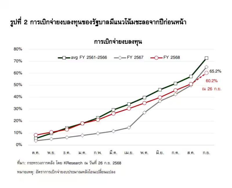 ข้อมูล ณ 26 ก.ย. 2568 พบว่า การเบิกจ่ายงบลงทุนอยู่ที่เพียง 60% ต่ำกว่าช่วงเดียวกันของปีก่อนที่ 65% ขณะที่งบปี 2569 มีแนวโน้มชะลอตัวจากฐานสูงในปีที่ผ่านมา ซึ่งทำให้รัฐบาลจำเป็นต้อง เร่งรัดการเบิกจ่ายในช่วงโค้งสุดท้าย เพื่อพยุงเศรษฐกิจควบคู่กับมาตรการกระตุ้นระยะสั้น
