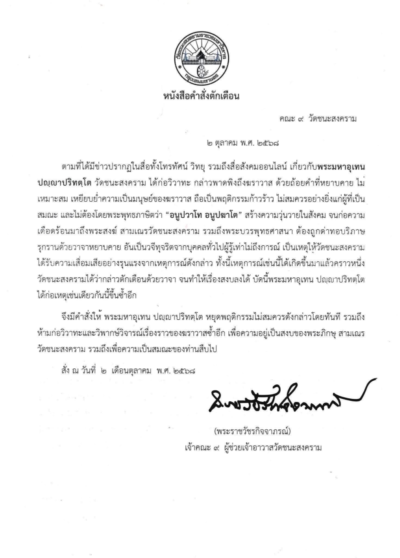 ล่าสุด แพรรี่ ไพรวัลย์ วรรณบุตร ได้โพสต์ภาพเกี่ยวกับหนังสือคำสั่งตักเตือนถึงงพระอุเทน วัดชนะสงครามฯ โดยมีเนื้อหาระบุว่า
