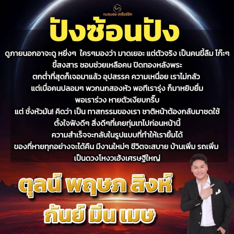 แต่เบื่อคนปลอม ๆ พวกนกสองหัว พอทีเรารุ่งก็มาหยิบยืม พอเราร่วง หายตัวเงียบ แต่ ชั่งหัวมัน คิดว่าเป็นทาสกรรมของเรา ชาติหน้าต้องกลับมาชดใช้ ตั้งใจฟังดี ๆ สิ่งดี ๆ ที่เคยทุ่มเทไปก่อนหน้านี้ ความสำเร็จจะกลับในรูปแบบที่ทำให้เรายิ้มได้ ของที่หายทุกอย่างจะได้คืน มีงานใหม่ ๆ ชีวิตจะสบาย บ้านเพิ่ม รถเพิ่ม เป็นดวงโหงวเฮ้งเศรษฐีใหม่