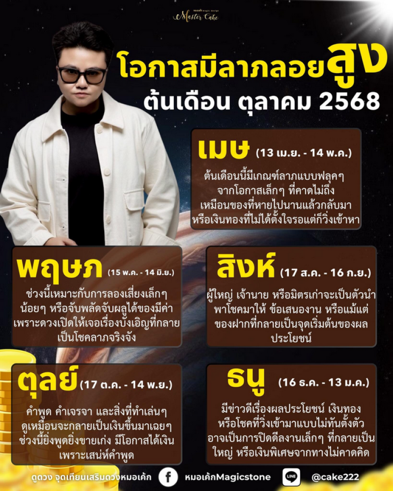 หมอเค้ก เปิดชะตา 5 ราศี ต้นเดือนตุลาคม โอกาสมีลาภลอยสูง เผย ราศีใดเหมาะกับการเสี่ยง ราศีใด มีคนนำพาโชคมาให้ มีโอกาสได้เงินเพราะคำพูดด้วย
