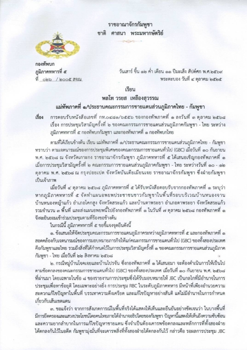 วันที่ 5 ต.ค. 2568 ทางภูมิภาคทหารที่ 5 กัมพูชา ได้ทําหนังสือตอบกลับมายัง พล.ท.วรยส เหลืองสุวรรณ แม่ทัพภาคที่ 1 ต่อข้อเรียกร้องให้ภูมิภาคทหารที่ 5 กัมพูชา ได้จัดทําแผนอพยพประชาชนชาวกัมพูชาในพื้นที่รอบบริเวณบ้านหนองจาน บ้านหนองหญ้าแก้ว อําเภอโคกสูง จังหวัดสระแก้ว บ้านตาพระยา อําเภอตาพยา จังหวัดสระแก้วรวม 3 พื้นที่ และส่งมอบแผนอพยพนี้ให้กับกองทัพภาคที่ 1 ภายในวันที่ 7 ต.ค. จึงยอมประชุม คณะกรรมการชายแดนส่วนภูมิภาคไทย-กัมพูชา (RBC) ที่จะจัดขึ้นในวันที่ 10-12 ต.ค. 2568 ที่กรุงปอยเปต จังหวัดบันเตียเมียนเจย ราชอาณาจักรกัมพูชา ซึ่งฝ่ายกัมพูชาเป็นเจ้าภาพ