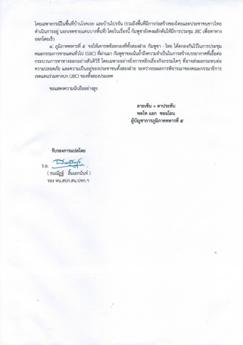 4.ภูมิภาคทหารที่ห้าขอให้เคารพข้อตกลงที่ทั้งสองฝ่าย กัมพูชา-ไทย ได้ตกลงกันไว้ในการประชุม คณะกรรมการชายแดนทั่วไป(GBC) ที่ผ่านมา กัมพูชาขอเน้นย้ําถึงความจําเป็นในการสร้างบรรยากาศที่เอื้อต่อกระบวนการหาทางออกอย่างสันติวิธีโดยเฉพาะอย่างยิ่งการหลีกเลี่ยงกิจกรรมใดๆ ที่อาจส่งผลกระทบต่อความปลอดภัยและความเป็นอยู่ของประชาชนทั้งสองฝ่ายระหว่างรอการพิจารณาของคณะกรรมาธิการ เขตแดนร่วม(JBC) ของทั้งสองประเทศ