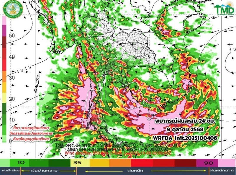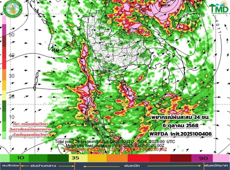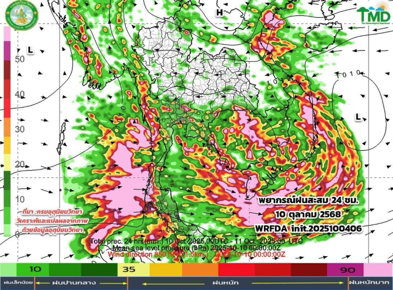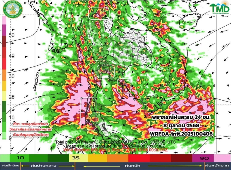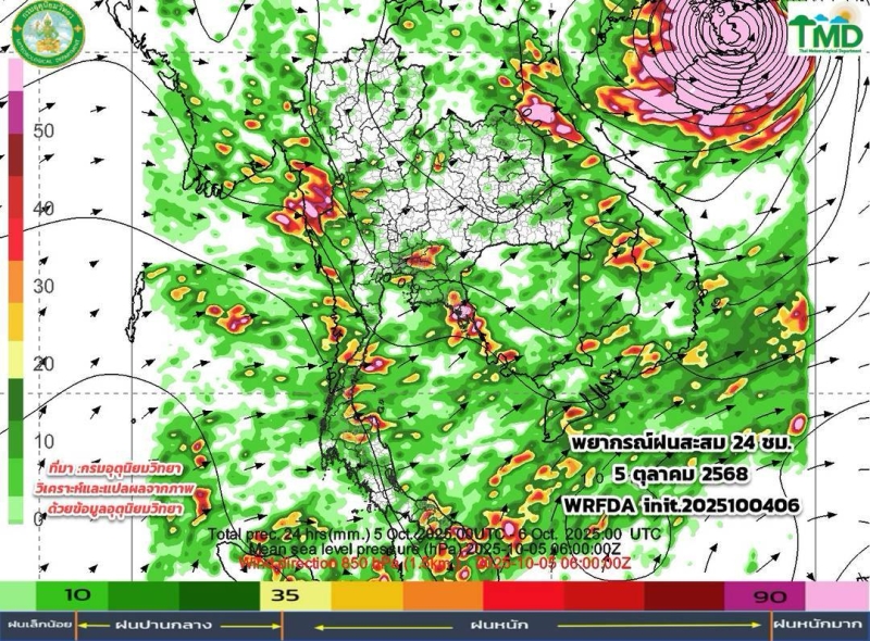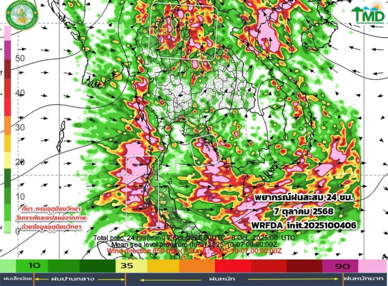 วันที่ 5 ต.ค. 68 กรมอุตุนิยมวิทยา อัพเดทผลการพยากรณ์ฝนสะสมรายวัน (ทุกๆ 24 ชม.:(นับตั้งแต่ 07.00น. ถึง 07.00น.วันรุ่งขึ้น) และลมที่ระดับ 850hPa (1.5 กม.)9 วันล่วงหน้า ระหว่าง 5-13 ต.ค.68 จากแบบจำลองของกรมอุตุนิยมวิทยา (TMD-WRFDA)