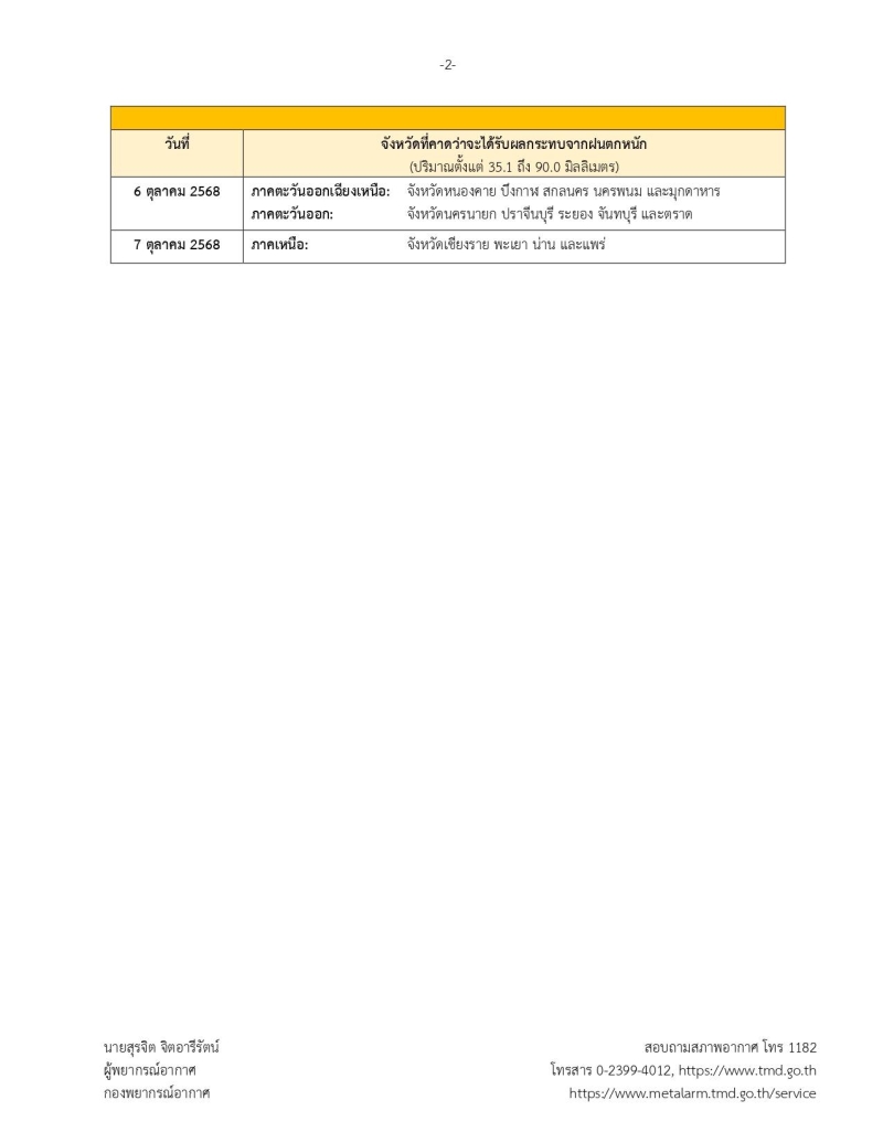 อย่างไรก็ตามขอให้ประชาชนติดตามประกาศจากกรมอตุนิยมวิทยาอย่างใกล้ชิด และสามารถติดตามข้อมูลที่เว็บไซต์ กรมอุตุนิยมวิทยาหรือโทร 0-2399-4012-13 และ 1182 ได้ตลอด 24 ชั่วโมง ประกาศ ณ วันที่ 6 ตุลาคม พ.ศ. 2568 เวลา 05.00 น. กรมอุตุนิยมวิทยาจะออกประกาศฉบับต่อไปในวันที่ 6 ตุลาคม พ.ศ. 2568 เวลา 11.00 น.