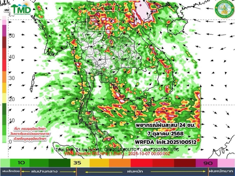 จากอิทธิพลของพายุแมตโม ส่งผลให้ในช่วงวันที่ 6-7 ต.ค. 68 มรสุมตะวันตกเฉียงใต้ที่พัดปกคลุมทะเลอันดามัน ประเทศไทย และอ่าวไทยจะมีกำลังแรงขึ้น ทำให้ประเทศไทยตอนบนมีฝนตกหนักบางแห่งบริเวณภาคเหนือ และภาคตะวันออกเฉียงเหนือ รวมทั้งด้านรับมรสุมของภาคตะวันออก ขอให้ประชาชนในบริเวณดังกล่าวระวังอันตรายจากฝนตกหนักและฝนที่ตกสะสมซึ่งอาจทำให้เกิดน้ำท่วมฉับพลัน น้ำป่าไหลหลาก และน้ำล้นตลิ่ง โดยเฉพาะพื้นที่ลาดเชิงเขาใกล้ทางน้ำไหลผ่าน พื้นที่ลุ่ม และพื้นที่น้ำท่วมขัง