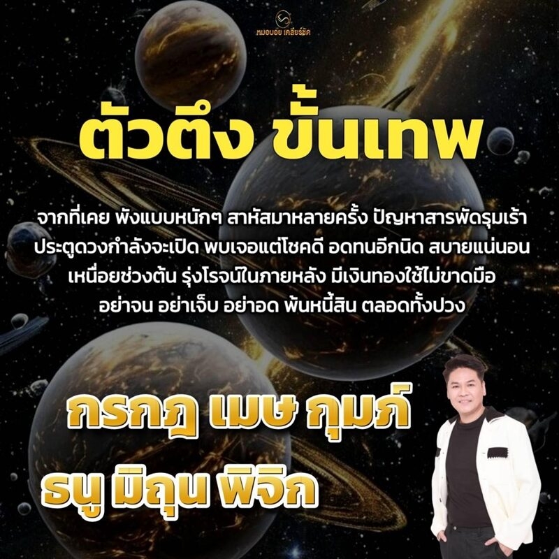 สำหรับ หมอบอย เคลียร์ชัด เปิดชะตา 6 ราศี ตัวตึง ขั้นเทพ ประตูดวงกำลังจะเปิด พบเจอแต่โชคดี มีเงินทองใช้ไม่ขาดมือ หลังสาหัสมาหลายครั้ง ประกอบด้วย ราศีกรกฎ ราศีเมษ ราศีกุมภ์ ราศีธนู ราศีมิถุน และ ราศีพิจิก โดยมีรายละเอียดดังนี้