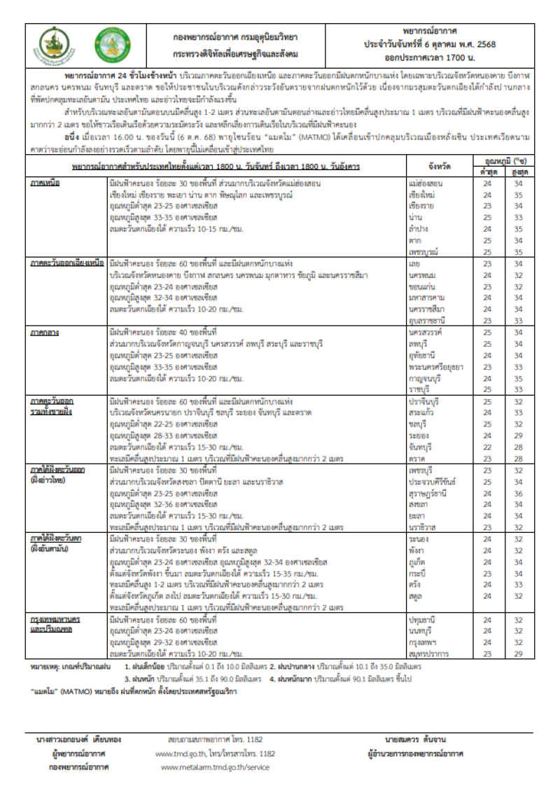 อนึ่ง เมื่อเวลา 16.00 น. ของวันนี้ (6 ต.ค. 68) พายุโซนร้อน แมตโม (MATMO) ได้เคลื่อนเข้าปกคลุมบริเวณเมืองหลั่งเซิน ประเทศเวียดนาม คาดว่าจะอ่อนกำลังลงอย่างรวดเร็วตามลำดับ โดยพายุนี้ไม่เคลื่อนเข้าสู่ประเทศไทย