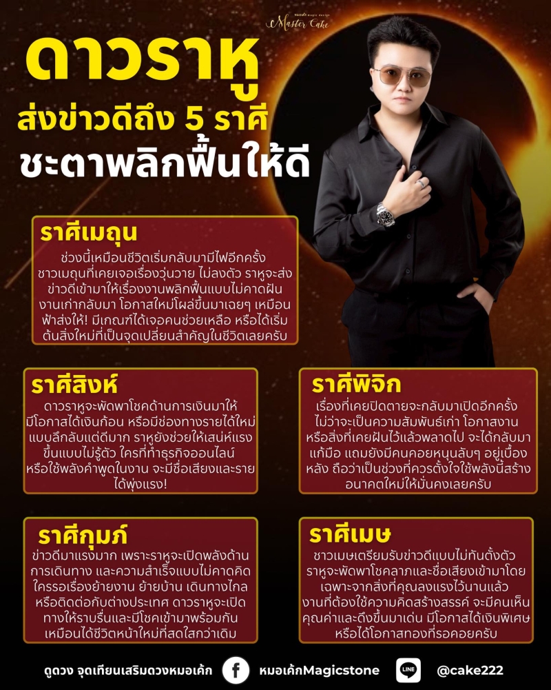 สำหรับ หมอเค้กดลบันดาล เผยถึงดาวราหูส่งข่าวดีถึง 5 ราศี ชะตาพลิกฟื้นให้ดี ช่วงนี้เหมือนชีวิตเริ่มกลับมามีไฟอีกครั้ง ที่เคยเจอเรื่องวุ่นวาย ไม่ลงตัว ราหูจะส่งข่าวดีเข้ามาให้เรื่องงานพลิกฟื้นแบบไม่คาดฝัน งานเก่ากลับมา โอกาสใหม่โผล่ขึ้นมาเฉยๆ เหมือนฟ้าส่งมาให้