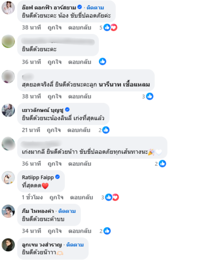 แฟนคลับและเพื่อนในวงการต่างเข้ามาคอมเมนต์แสดงความยินดีรัว ๆ ทั้งเรื่องรถในฝันและความสำเร็จที่เกิดขึ้นจากความขยันของเธอเอง เรียกได้ว่าเป็นโมเมนต์อบอุ่นที่เต็มไปด้วยกำลังใจทั้งจากแฟนคลับและคนรอบตัว