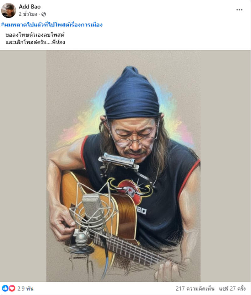 ผมพลาดไปแล้วที่ไปโพสต์เรื่องการเมือง ขอลงโทษตัวเองลบโพสต์ และเลิกโพสต์ครับพี่น้อง
