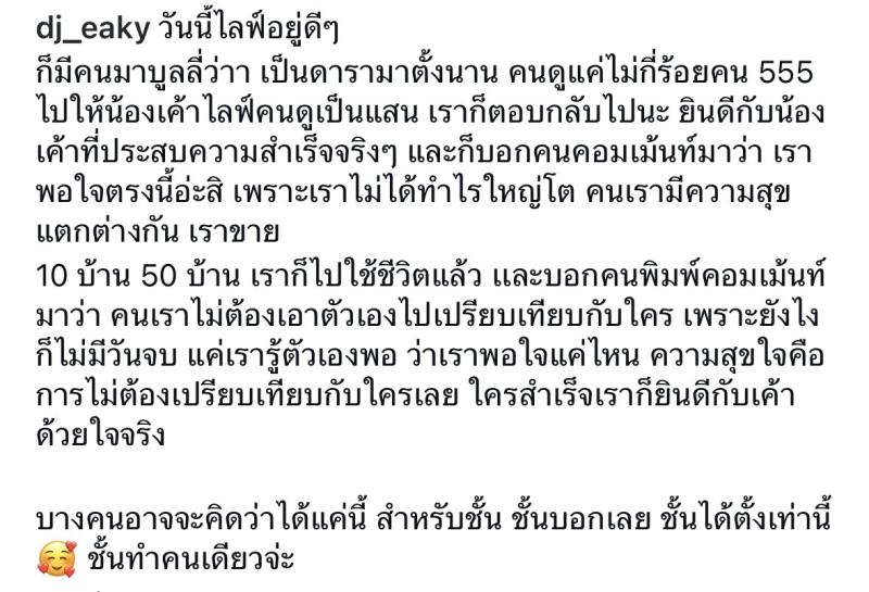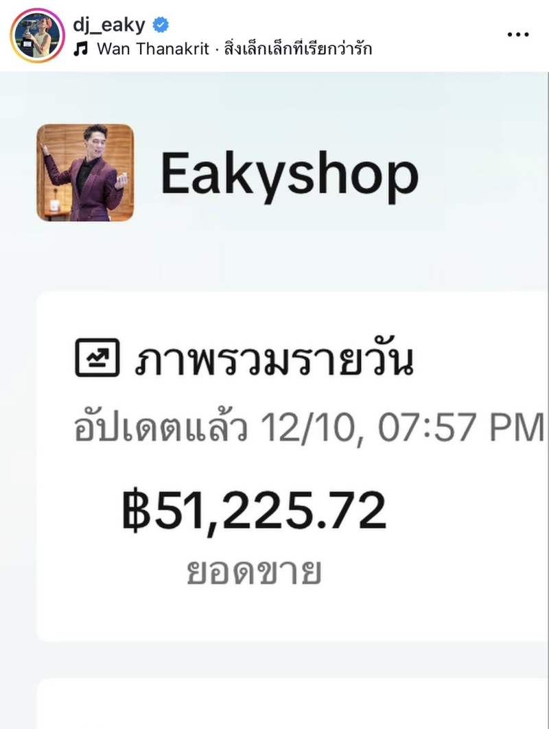 แต่ล่าสุดกลับเจอคอมเมนต์สุดแซะกลางไลฟ์ มีคนเหน็บว่า เป็นดารามาตั้งนาน แต่คนดูไลฟ์สดแค่หลักร้อย งานนี้ เอกกี้ ไม่ปล่อยผ่าน โพสต์ภาพยอดขายจริงในไอจีส่วนตัว @dj_eaky ที่มียอดกว่า 21,896.04 บาท พร้อมข้อความตอบกลับแบบเจ็บแต่จบว่า