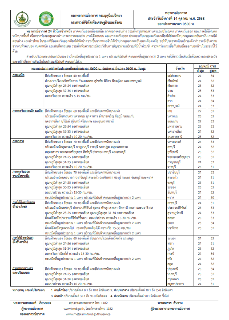 วันที่ 14 ตุลาคม 2568 ทางกรมอุตุนิยมวิทยาได้พยากรณ์อากาศ 24 ชั่วโมงข้างหน้า ภาคตะวันออกเฉียงเหนือ ภาคกลางตอนล่าง รวมทั้งกรุงเทพมหานครและปริมณฑล ภาคตะวันออก และภาคใต้มีฝนตกหนักบางพื้นที่ เนื่องจากร่องมรสุมพาดผ่านภาคกลางตอนล่าง ภาคใต้ตอนบน และภาคตะวันออก ประกอบกับมรสุมตะวันตกเฉียงใต้ยังคงพัดปกคลุมทะเลอันดามัน ภาคใต้ตอนล่าง และอ่าวไทย ในขณะที่มีลมตะวันออกเฉียงใต้พัดนำความชื้นจากทะเลจีนใต้เข้าปกคลุมภาคตะวันออกเฉียงเหนือ ขอให้ประชาชนในบริเวณดังกล่าวระวังอันตรายจากฝนฟ้าคะนอง ฝนตกหนัก และฝนที่ตกสะสม รวมทั้งเพิ่มความระมัดระวังในการสัญจรผ่านบริเวณที่มีน้ำท่วมขัง ควรพกร่มและเสื้อกันฝนเมื่อออกนอกบ้านในระยะนี้ไว้ด้วย
