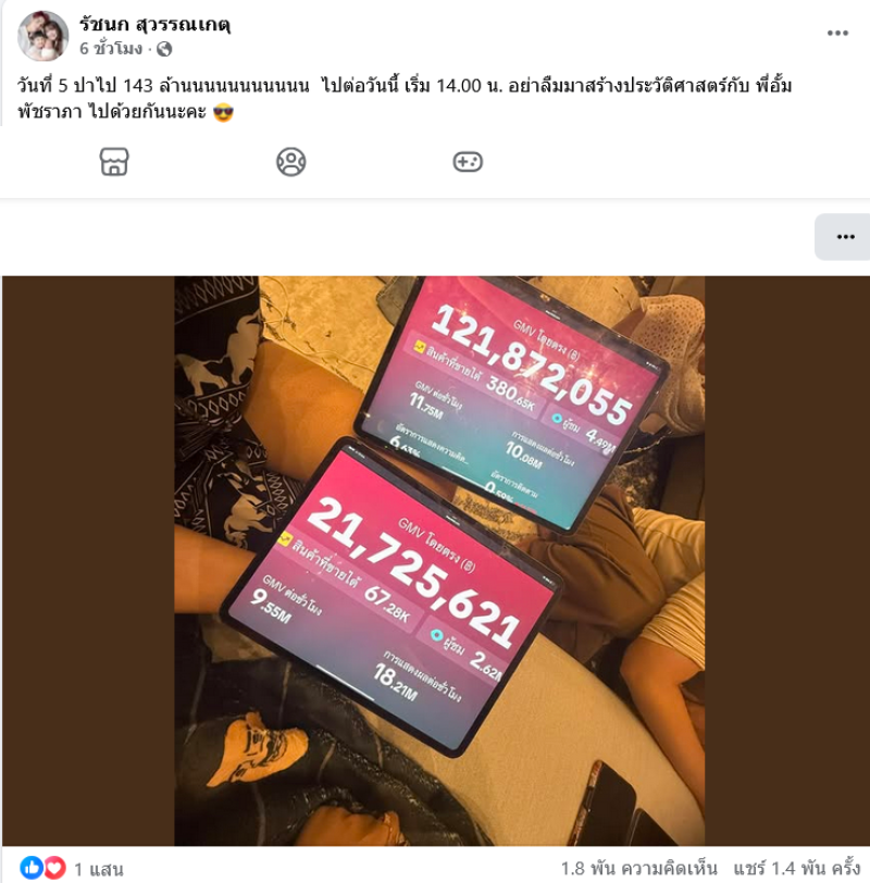 ตั้งแต่เริ่มมีเทศกาล เจนนี่ ก็มีคนดัง คนบันเทิงแห่มาบ้านเพื่อไลฟ์ขายของกว่า 100 คนเลยทีเดียว จนกระทั่งล่าสุดสาวเจนนี่ ได้โพสต์ปิดยอดวันนี้ว่า วันที่ 5 ปาไป 143 ล้านนนนนนนนนนน ไปต่อวันนี้ เริ่ม 14.00 น. อย่าลืมมาสร้างประวัติศาสตร์กับ พี่อั้ม พัชราภา ไปด้วยกันนะคะ