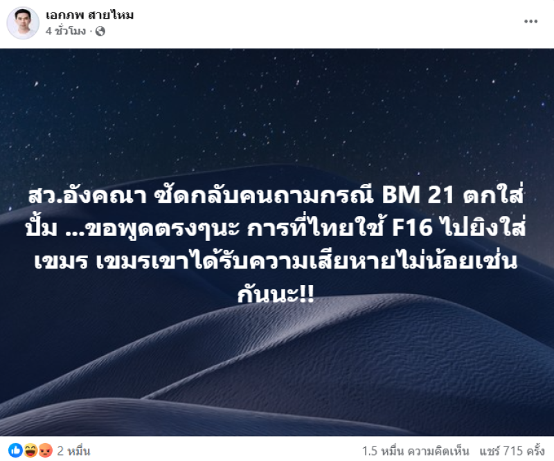 วันที่ 14 ตุลาคม 2568 นายเอกภพ สายไหม นักเคลื่อนไหวทางสังคมชื่อดัง ได้โพสต์ข้อความผ่านเฟซบุ๊กส่วนตัว แสดงความไม่เห็นด้วยต่อกรณีการให้สัมภาษณ์ของ ส.ว.อังคณา ที่ออกมาตอบโต้ประชาชน กรณี จรวด BM-21 จากฝั่งกัมพูชาตกใส่ปั๊มน้ำมันในไทย โดยระบุว่า