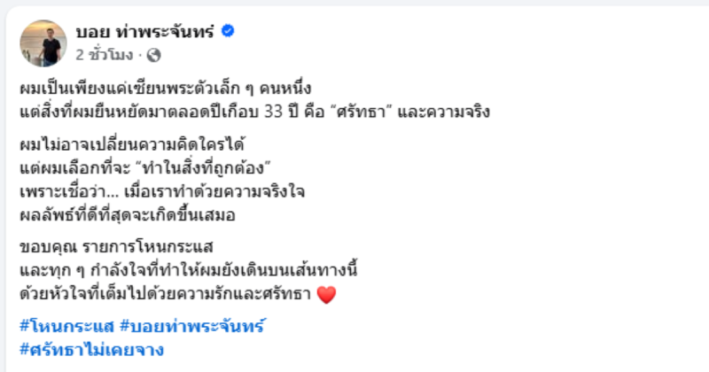 ปิดท้ายด้วยการขอบคุณรายการโหนกระแสและทุกกำลังใจจากผู้ที่ติดตาม พร้อมย้ำว่า ยังคงเดินบนเส้นทางแห่งศรัทธา ด้วยหัวใจที่รักและเชื่อในความจริงเสมอ