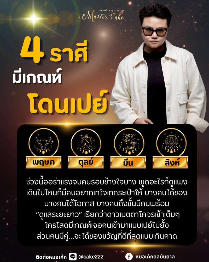 ช่วงนี้ถือเป็นโอกาสทองของ 4 ราศีที่โดนเปย์แบบจัดเต็ม ทั้งเรื่องความรัก การงาน และโอกาสพิเศษต่าง ๆ หมอเค้กแนะนำให้ใช้พลังออร่าที่แรงอยู่ในช่วงนี้ให้เต็มที่ ทั้งสร้างความสัมพันธ์ สร้างโอกาส และเพิ่มความมั่นใจให้กับตัวเอง
