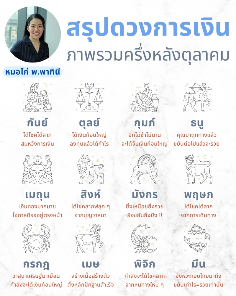 เข้าสู่ช่วงหลังของเดือนกันแล้ว หมอไก่ พ.พาทินี ได้ทำการสรุปดวงการเงินของภาพรวมครึ่งหลังตุลาคมมาให้ทุกคนกัน ราศีใดดวงการเงินเป็นอย่างไรบ้าง ดังนี้