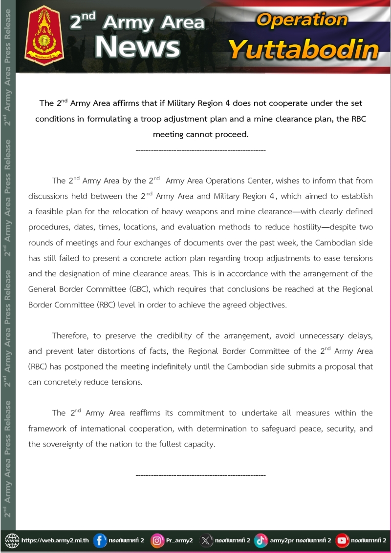 เพื่อรักษาความน่าเชื่อถือของข้อตกลง และป้องกันการยื้อเวลา กองทัพภาคที่ 2 จึงมีมติเลื่อนการประชุม RBC ออกไปโดยไม่มีกำหนด จนกว่าฝ่ายกัมพูชาจะมีข้อเสนอที่เป็นรูปธรรมและนำไปสู่การลดความตึงเครียดได้จริง