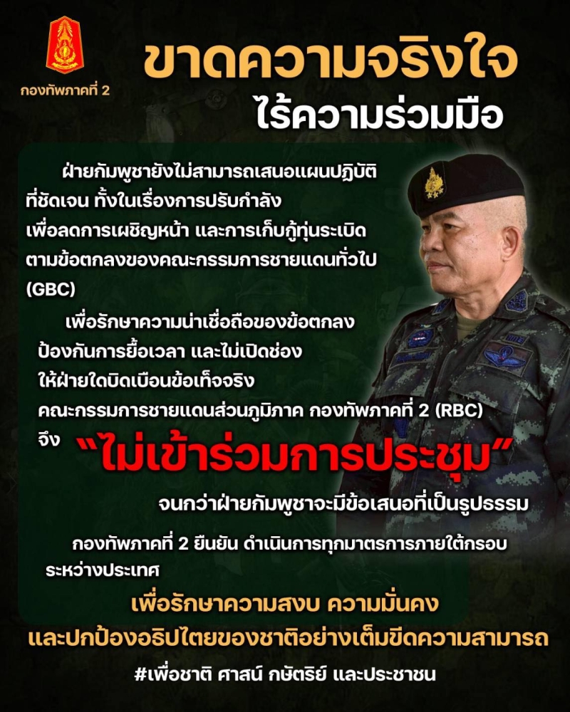 กองทัพภาคที่ 2 เบรกคุยกัมพูชาไม่มีกำหนด เหตุไร้ข้อเสนอแก้ความขัดแย้งจริงจัง