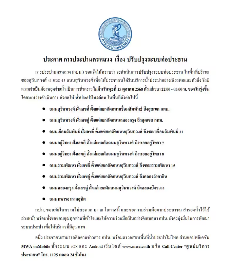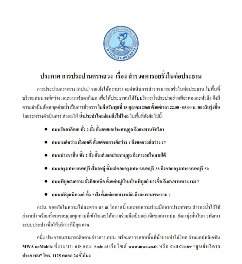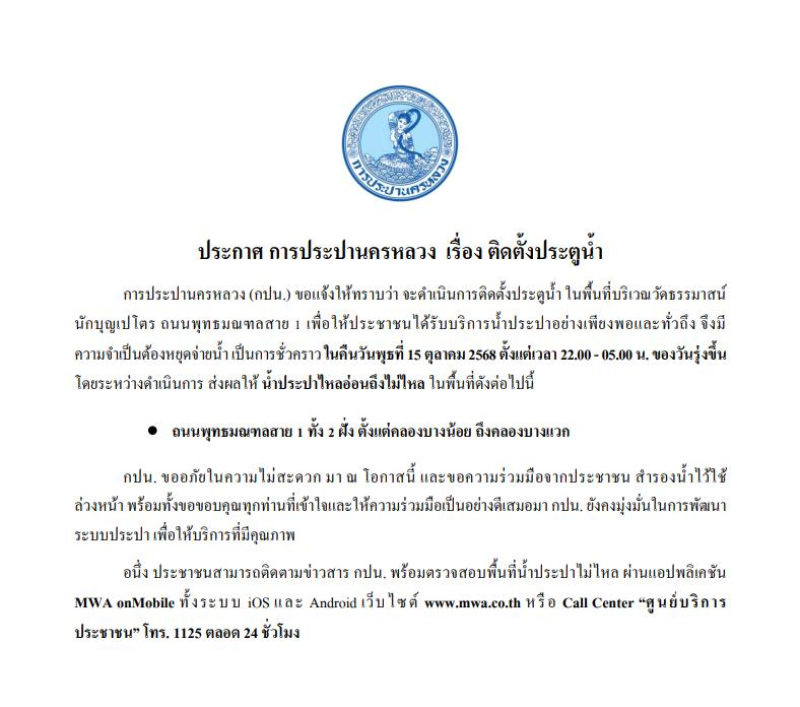 การประปานครหลวง (กปน.) ออกประกาศแจ้งประชาชนในหลายเขตพื้นที่ของกรุงเทพมหานครให้เตรียมสำรองน้ำไว้ใช้ หลังจากมีกำหนดดำเนินการซ่อมบำรุงระบบท่อประธานและติดตั้งประตูน้ำในหลายจุดพร้อมกัน คืนวันพุธที่ 15 ตุลาคม 2568 ตั้งแต่เวลา 22.00 น. ถึง 05.00 น. ของวันรุ่งขึ้น ซึ่งจะทำให้ น้ำประปาไหลอ่อนถึงไม่ไหล รวมกว่า 20 พื้นที่ทั่วกรุง