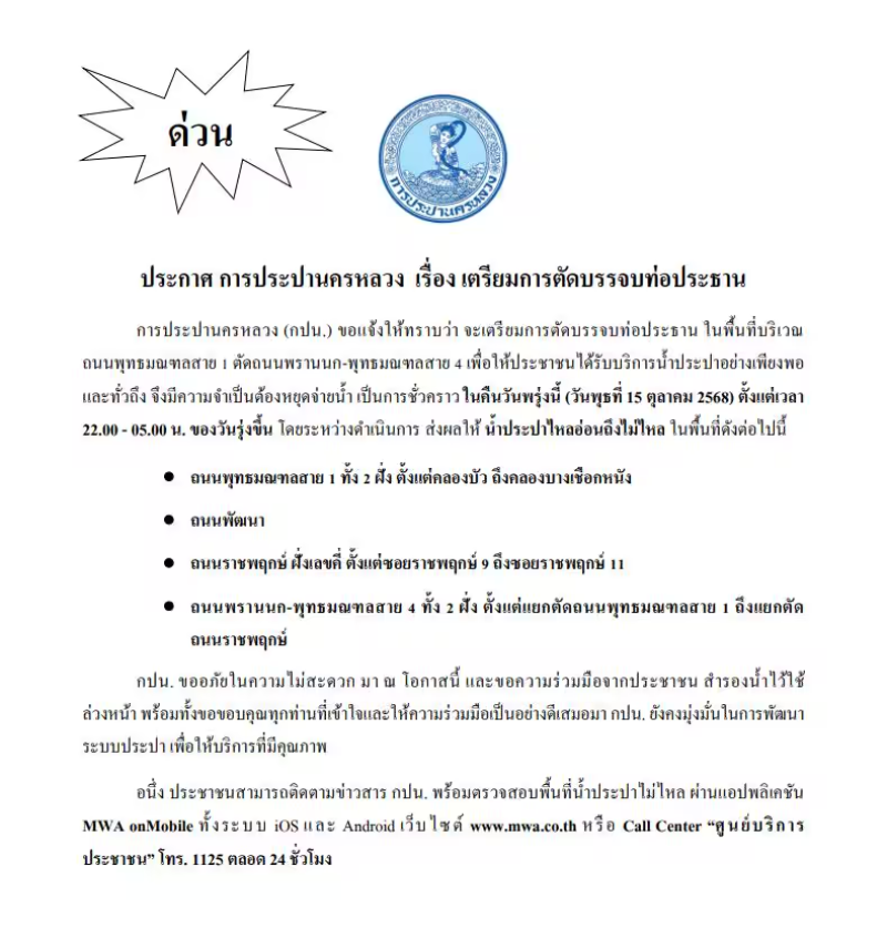 การประปานครหลวงเตือนน้ำไม่ไหล 20 พื้นที่ คืนวันที่ 15 ต.ค. 2568 ถึงเช้าวันรุ่งขึ้น