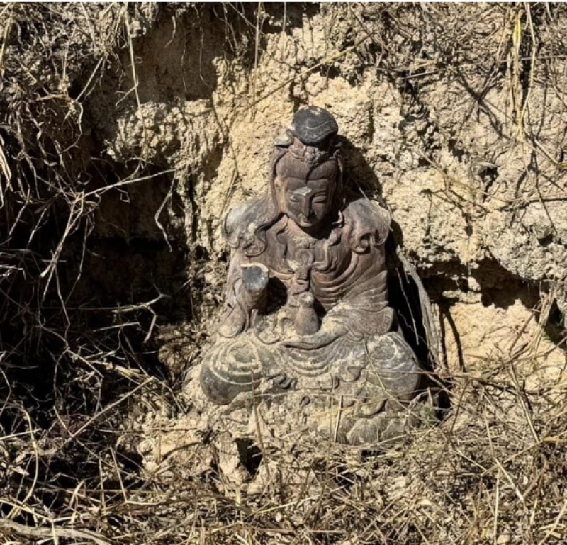 เจ้าแม่กวนอิมโบราณกลางคลอง หลังดินยุบ เผยอักษรคล้ายโบราณใต้ฐาน