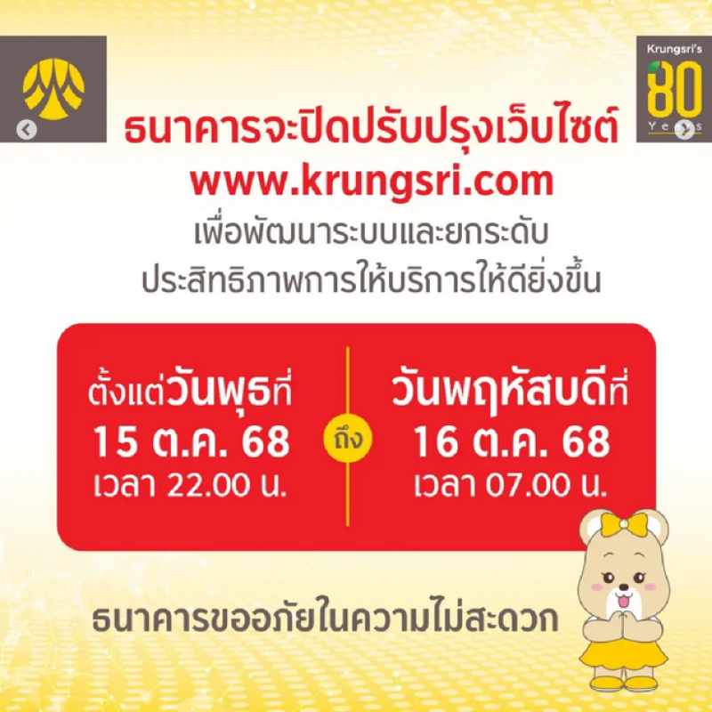 ธนาคารกรุงศรีอยุธยา ธนาคารจะปิดปรับปรุงเว็บไซต์ www.krungsri.com เพื่อพัฒนาระบบ และยกระดับประสิทธิภาพการให้บริการให้ดียิ่งขึ้น ตั้งแต่วันพุธที่ 15 ต.ค.68 เวลา 22.00 น. ถึงวันพฤหัสบดีที่ 16 ต.ค.68 เวลา 07.00 น. ธนาคารขออภัยในความไม่สะดวก