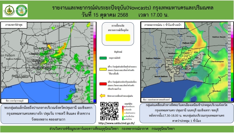 วันที่ 15 ตุลาคม 2568 กรมอุตุนิยมวิทยาได้รายงานการตรวจพบกลุ่มฝน เล็กน้อยถึงปานกลาง เคลื่อนตัวเข้าปกคลุมในหลายพื้นที่ของภาคกลางตอนล่าง โดยเฉพาะใน จังหวัดกรุงเทพมหานคร ปทุมธานี นนทบุรี ฉะเชิงเทรา และชลบุรี