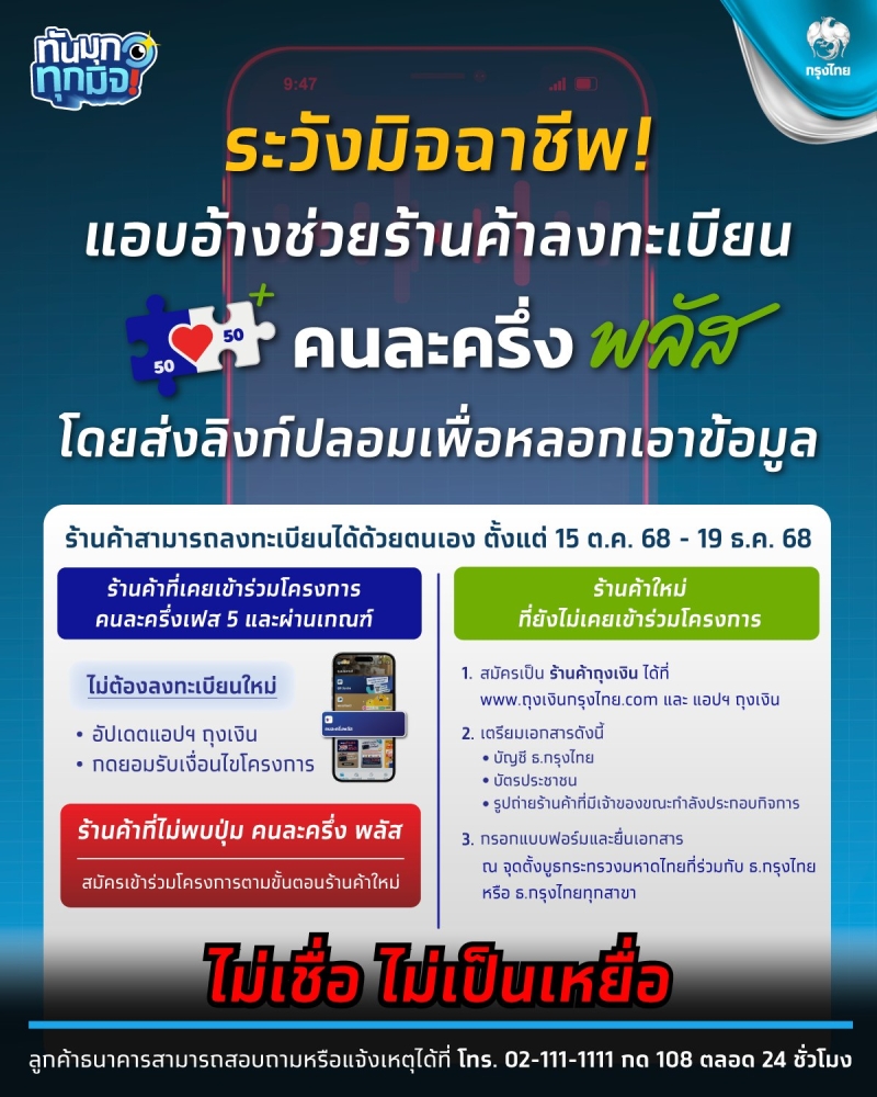 วันที่ 16 ต.ค. 2568 ธนาคารกรุงไทย แจ้งเตือนระวังมิจฉาชีพ แอบอ้างช่วยร้านค้าลงทะเบียนโครงการคนละครึ่ง พลัส โดยการส่งลิงก์ปลอมหลอกเอาข้อมูล กลโกงมิจฉาชีพ
