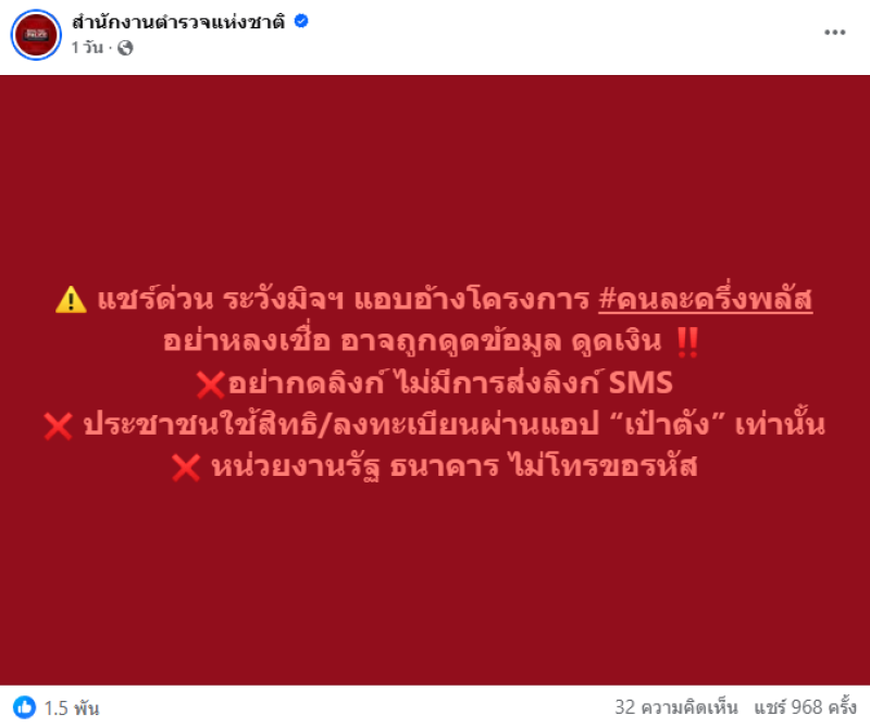 สำนักงานตำรวจ แจ้งเตือนด่วน! ถึงประชาชนทุกคน ระวังภัยคนละครึ่งพลัส