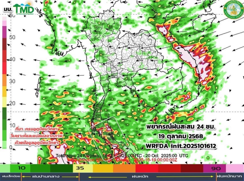 วันที่ 17 ต.ค.2568 ทางกรมอุตุนิยมวิทยาได้อัพเดทผลการพยากรณ์ฝนสะสมรายวันและลมที่ระดับ 850 hPa (1.5 กม.) 10 วันล่วงหน้า เฉดสีแสดงถึงปริมาณฝน (มม.) สีเขียว ฝนเล็กน้อย / สีแดง ฝนหนัก (มากกว่า 35.1 มม.)