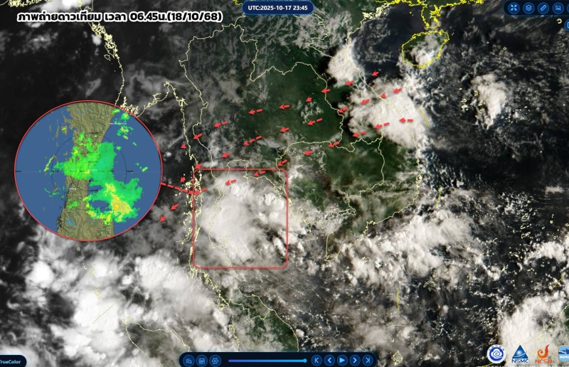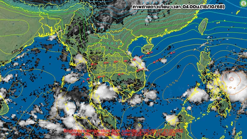 อัพเดทภาพถ่ายดาวเทียมและภาพเรดาร์ เช้าวันนี้ (18/10/68) กลุ่มเมฆฝนฟ้าคะนอง ปกคลุมบริเวณภาคใต้ฝั่งตะวันออกและในอ่าวไทย และภาพเรดาร์ตรวจพบกลุ่มฝนฟ้าคะนองปกคลุม จ.ชุมพร สราษฎร์ธานี ภาคใต้ฝั่งอ่าวไทย กำลังเคลื่อนตัวทางตะวันตกเฉียงใต้ ยังต้องระวังฝนตกหนักในระยะนี้