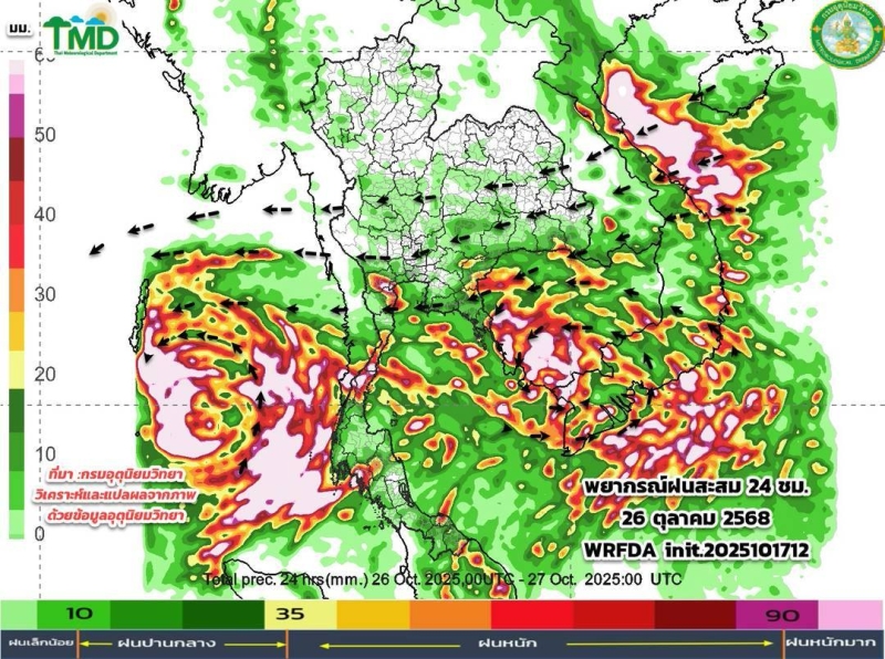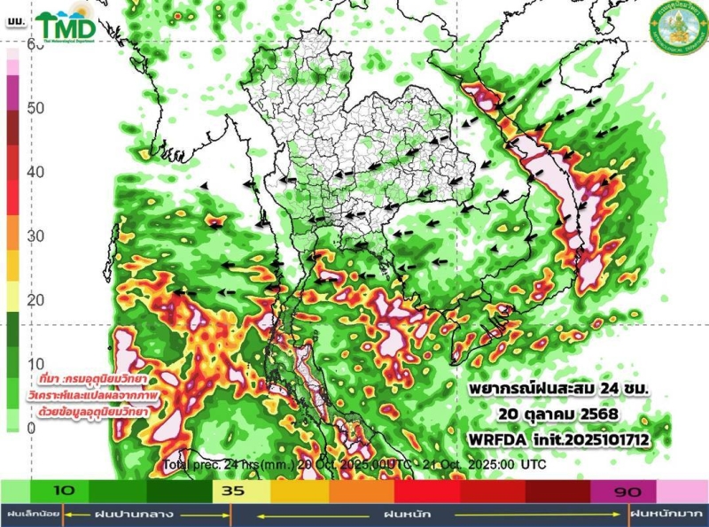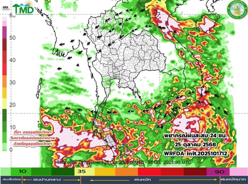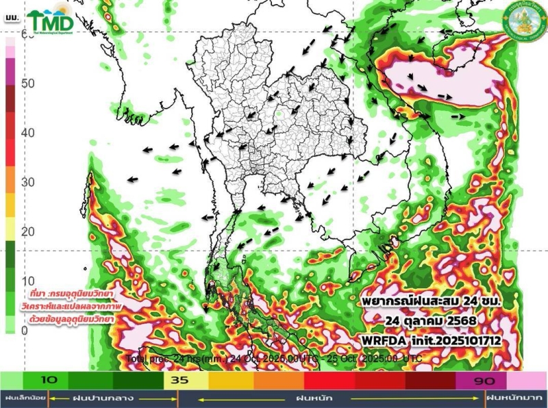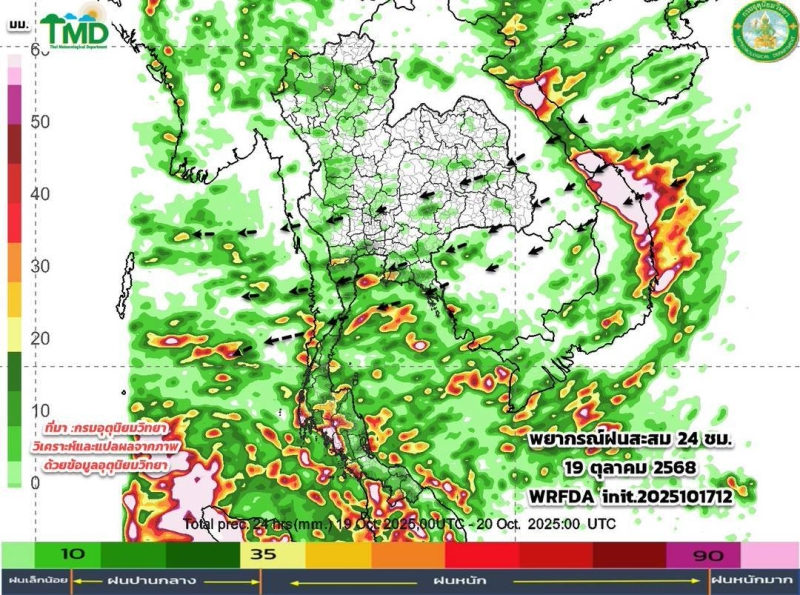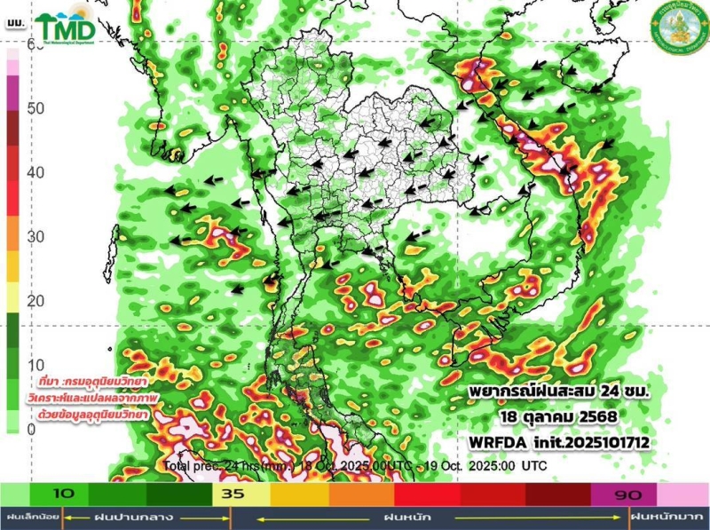 วันที่ 18 ต.ค. 68 กรมอุตุนิยมวิทยา อัพเดทผลการพยากรณ์ฝนสะสมรายวัน (ทุกๆ 24 ชม. (นับตั้งแต่ 07.00น. ถึง 07.00น.วันรุ่งขึ้น) และลมที่ระดับ 925hPa (750ม.)10 วันล่วงหน้า ระหว่าง 18-27 ต.ค.68 จากแบบจำลองของกรมอุตุนิยมวิทยา (TMD-WRFDA) เฉดสีแสดงถึงปริมาณฝน (มม.) สีเขียวฝนเล็กน้อย สีแดงหมายถึงฝนหนัก (มากว่า 35.1มม.)