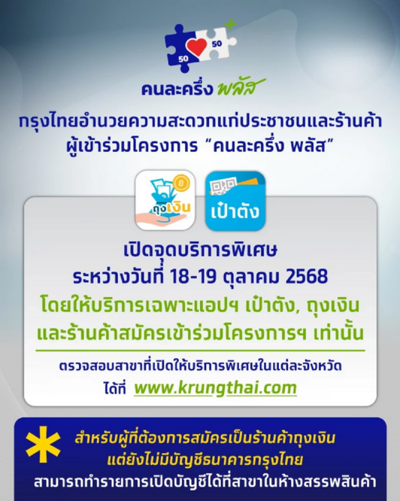 วันที่ 18 ตุลาคม 2568 มีรายงานว่า ธนาคารกรุงไทย อำนวยความสะดวกแก่ประชาชนและร้านค้า ผู้เข้าร่วมโครงการ “คนละครึ่งพลัส” เปิดจุดบริการพิเศษ ระหว่างวันที่ 18-19 ตุลาคม 2568 โดยให้บริการเฉพาะแอปฯ เป๋าตัง, ถุงเงิน และร้านค้าสมัครเข้าร่วมโครงการฯ เท่านั้น เปิดให้บริการจำนวน 62 สาขา ตั้งแต่เวลา 08:30-16:00 น.