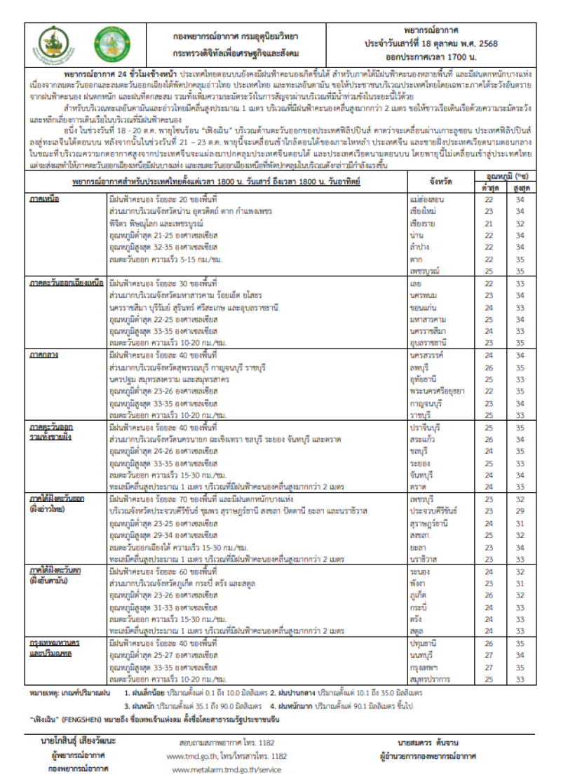 วันที่ 18 ตุลาคม 2568 ทางกรมอุตุนิยมวิทยาได้พยากรณ์อากาศ 24 ชั่วโมงข้างหน้า ประเทศไทยตอนบนยังคงมีฝนฟ้าคะนองเกิดขึ้นได้ สำหรับภาคใต้มีฝนฟ้าคะนองหลายพื้นที่ และมีฝนตกหนักบางแห่ง เนื่องจากลมตะวันออกและลมตะวันออกเฉียงใต้พัดปกคลุมอ่าวไทย ประเทศไทย และทะเลอันดามัน ขอให้ประชาชนบริเวณประเทศไทยโดยเฉพาะภาคใต้ระวังอันตรายจากฝนฟ้าคะนอง ฝนตกหนัก และฝนที่ตกสะสม รวมทั้งเพิ่มความระมัดระวังในการสัญจรผ่านบริเวณที่มีน้ำท่วมขังในระยะนี้ไว้ด้วย