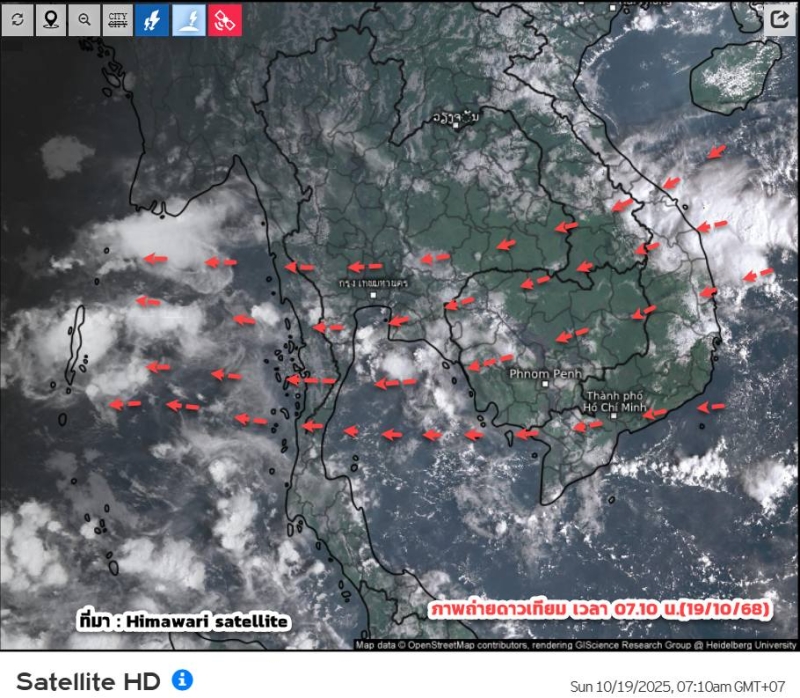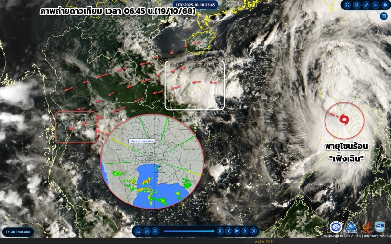 วันที่ 19 ต.ค. 69 กรมอุตุนิยมวิทยา อัพเดทภาพถ่ายดาวเทียม และภาพเรดาร์ เวลา 06.45 น.(19/10/68) กลุ่มเมฆฝนปกคลุมบริเวณภาคใต้ตอนบน ส่วนกลุ่มเมฆกลุ่มใหญ่ปกคลุมใกล้บริเวณพายุโซนร้อน เฟิงเฉิน บริเวณประเทศฟิลิปปินส์ กำลังเคลื่อนตัวลงสู่ทะเลจีนใต้