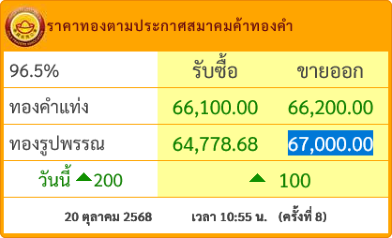 ราคาทองคำประจำวันที่ 20 ต.ค.2568 ปรับเพิ่มขึ้น 100 บาท เปรียบเทียบกับราคาสุดท้ายของเมื่อวานนี้ โดยทองรูปพรรณขายออกบาทละ 67,000.00 บาท ตามข้อมูลล่าสุดจากเว็บไซต์ของ สมาคมค้าทองคำ เมื่อเวลา เวลา 10:55 น.(ครั้งที่ 8)
