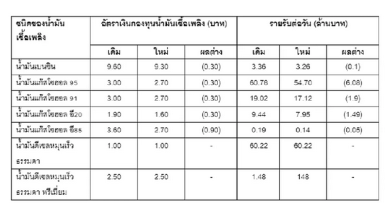 โดยลดราคาขายปลีกน้ำมันดีเซลลง 50 สตางค์/ลิตร จาก 31.44 บาท/ลิตร เป็น 30.94 บาท/ลิตร นอกจากนี้ยังมีการปรับลดราคาขายปลีกน้ำมันเบนซินลงทุกชนิด 30 สตางค์/ลิตร เพื่อให้ประชาชนได้รับประโยชน์โดยตรงจากการบริหารจัดการราคาพลังงานอย่างทันท่วงที ภายใต้หลักการทำงาน “เปิดเผย-โปร่งใส-ตรวจสอบได้” ของ กบน. และสำนักงานกองทุนน้ำมันเชื้อเพลิง (สกนช.) โดยมีรายละเอียดในตาราง ดังนี้