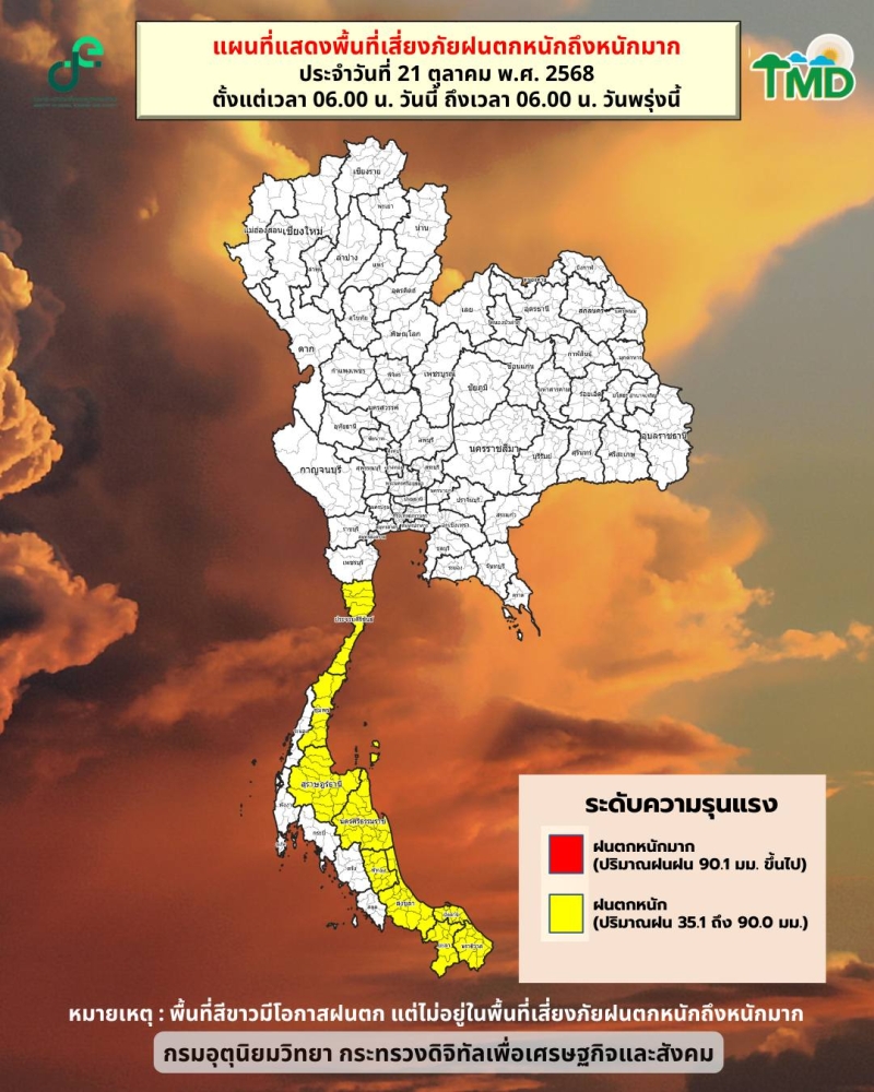 วันที่ 21 ตุลาคม 2568 กรมอุตุนิยมวิทยา พยากรณ์อากาศ 24 ชั่วโมงข้างหน้า ภาคใต้มีฝนตกหนักบางแห่ง ส่วนประเทศไทยตอนบนมีฝนน้อย โดยภาคเหนือ และภาคตะวันออกเฉียงเหนือเริ่มมีอากาศเย็นในตอนเช้า กับมีลมแรง และอุณหภูมิจะลดลง เนื่องจากบริเวณความกดอากาศสูงกำลังปานกลางจากประเทศจีนได้แผ่ลงมาปกคลุมประเทศจีนตอนใต้ และและประเทศเวียดนามตอนบนแล้ว