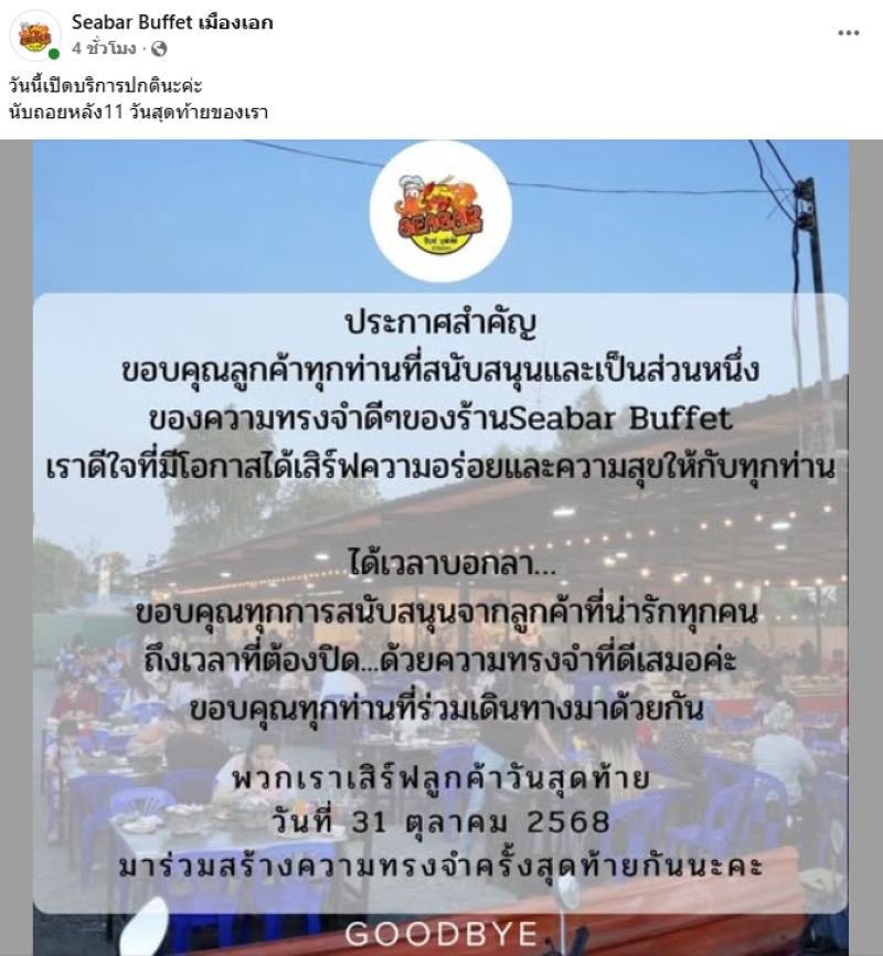 วันที่ 21 ตุลาคม 2568 ร้าน Seabar Buffet เมืองเอก จังหวัดปทุมธานี ร้านบุฟเฟต์ซีฟู้ดชื่อดังที่มีผู้ติดตามในเฟซบุ๊กกว่า 40,000 คน ได้โพสต์ผ่านเฟซบุ๊ก ชื่อ Seabar Buffet เมืองเอก ประกาศข่าวเศร้าผ่านเพจอย่างเป็นทางการว่า ทางร้านจะ ปิดให้บริการถาวรในวันที่ 31 ตุลาคม 2568 โดยนับถอยหลังเหลืออีกเพียง 11 วันสุดท้าย