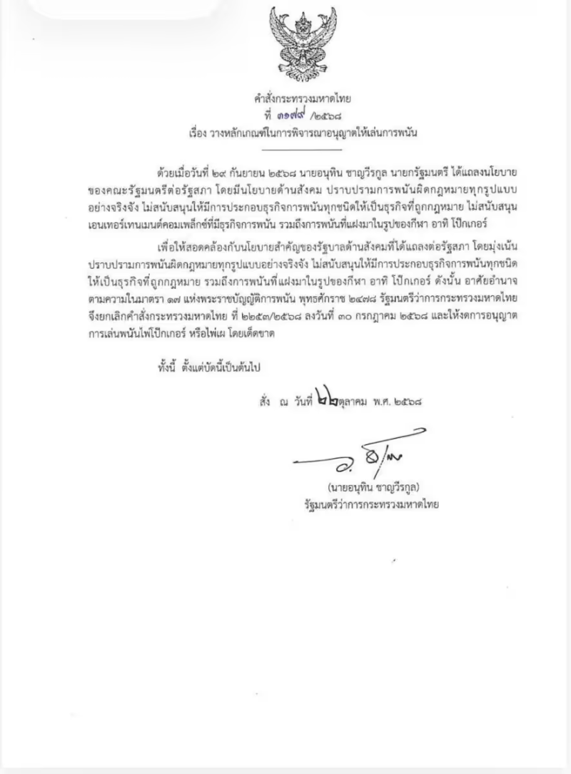 22 ตุลาคม 2568 นายอนุทิน ชาญวีรกูล นายกรัฐมนตรี และรัฐมนตรีว่าการกระทรวงมหาดไทย ลงนามคำสั่งกระทรวงมหาดไทยที่ 3179/2568 กำหนดหลักเกณฑ์ใหม่ในการอนุญาตให้เล่นการพนัน โดยมีสาระสำคัญให้ งดอนุญาตการเล่น ไพ่โป๊กเกอร์ และ ไพ่เผา ทุกกรณีอย่างเด็ดขาด